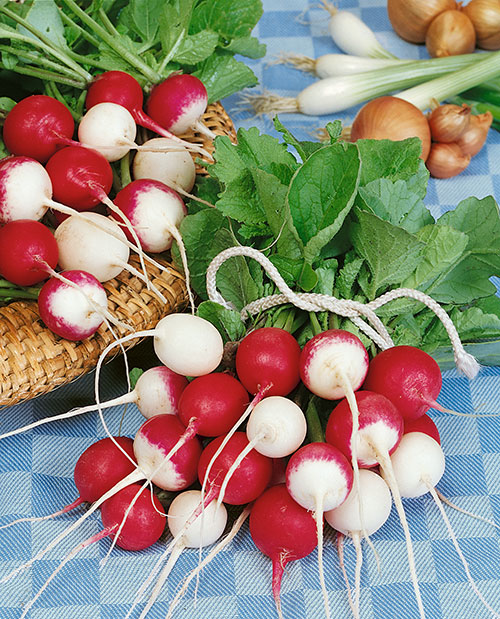 Small fast maturing radishes in a mix or red and white and bi-coloured. Great for salads. Excellent flavour.